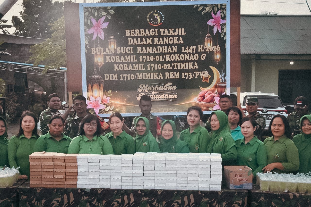 Timika, mojopaitnews.com – Berbagi kebahagiaan di bulan suci Ramadan, Koramil 1710-01/Kokonao dan Koramil 1710-02/Timika melaksanakan kegiatan pembagian takjil kepada pengguna jalan dan masyarakat yang melintas. Kegiatan tersebut dilaksanakan di Jalan Yos Sudarso, Timika, Jumat (6/3/2026).