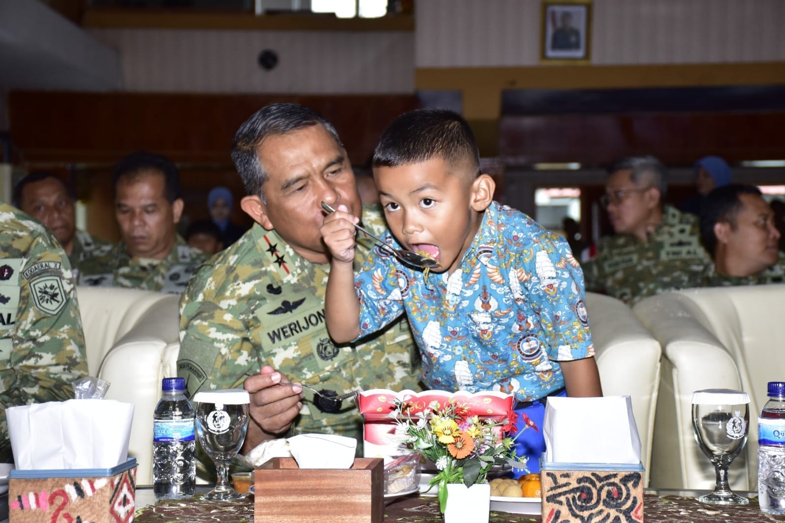 Jayapura – Dalam acara HUT ke-75 Yayasan Hangtuah di Aula Samudera Loka Kodaeral X Jayapura, terjadi momen yang sangat mengharukan. Komandan Komando Daerah Angkatan Laut (Dankodaeral) X, Mayjen TNI (Mar) Werijon, M.Han., CIQnR., CIQaR., mengajak siswa TK Hangtuah, Muhammad Atqan Putra Liambo, makan satu kotak nasi bersama.