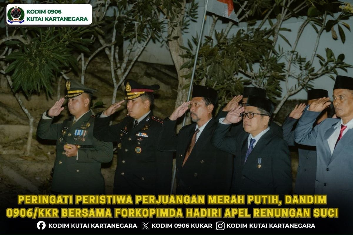 Kutai Kartanegara. mojopaitnews.com- Dalam rangka memperingati Peristiwa Perjuangan Merah Putih yang ke 79 tahun Dandim 0906/Kkr Letkol Arm Benny Budiman bersama unsur Forum Koordinasi Pimpinan Daerah (Forkopimda) menghadiri apel renungan suci pada (Senin malam 26/1/26) yang bertempat di TMP Wasah Batuah di jalan Pahlawan Kelurahan Sanga Sanga Dalam kecamatan Sanga Sanga.