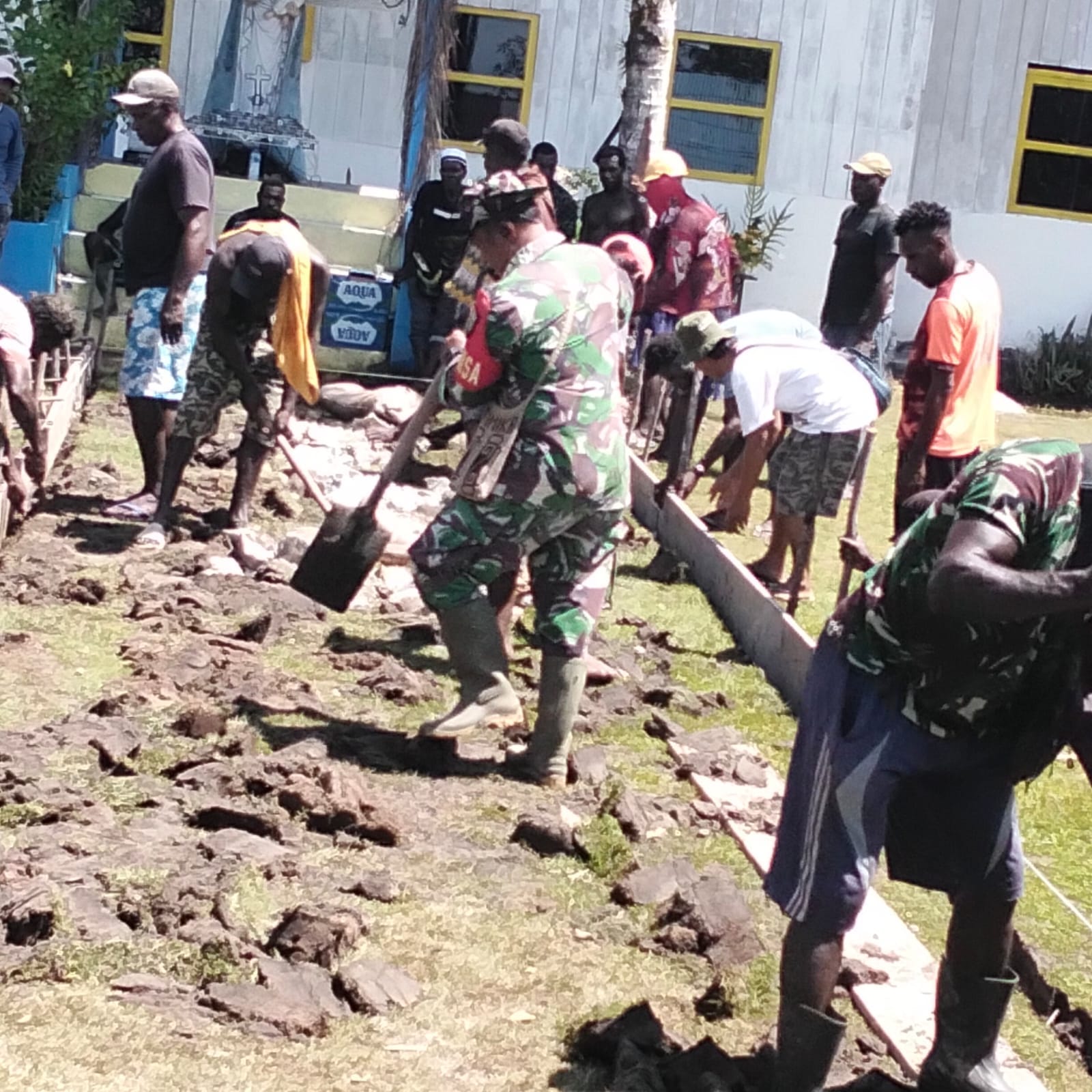 Timika, mojopaitnews.com – Wujud kerja nyata Babinsa Koramil 1710-01/Kokonao Serka Hendrik F Renyaan bersama warga masyarakat binaan tampak saat kegiatan gotong royong bersama masyarakat melaksanakan pengecoran jalan menuju sarana ibadah Gereja Katolik Kokonao di Kp. Kokonao, Distrik Mimika Barat, Kah. Mimika, Kamis (05/02/2026).