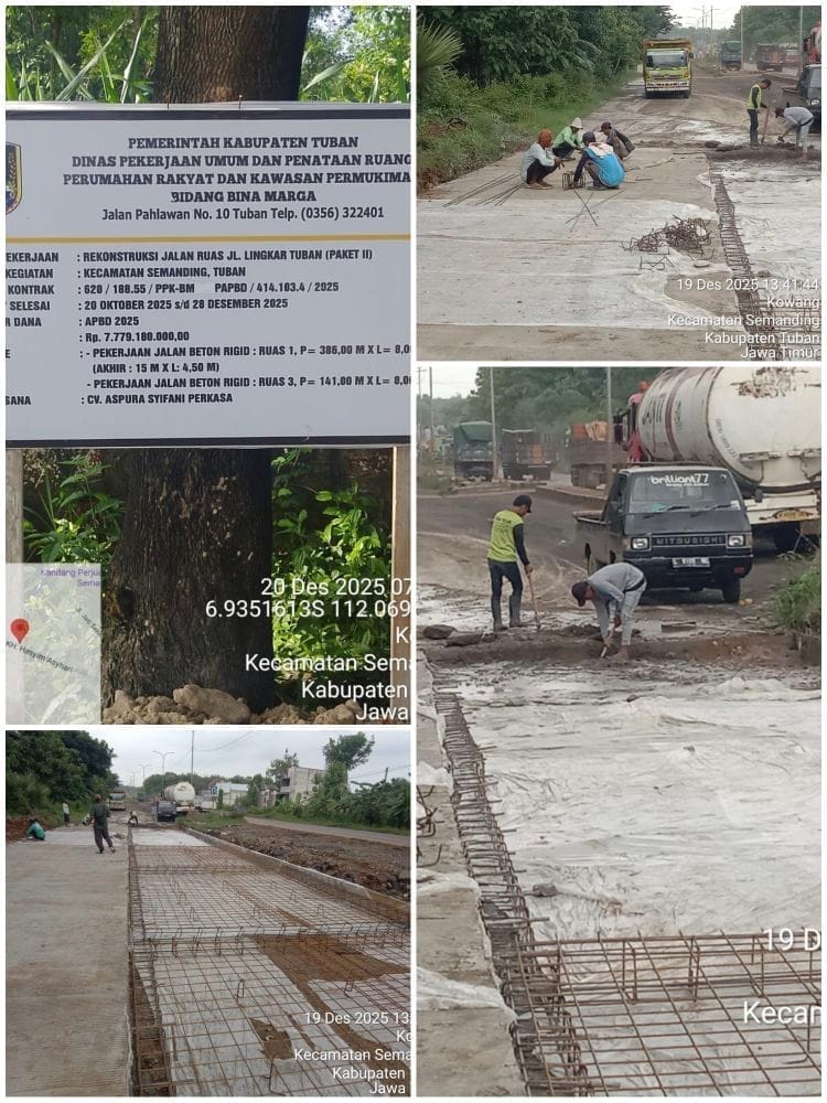 Tuban, Jawa Timur — Proyek rekonstruksi jalan ruas Jl. Lingkar Tuban Paket Dua, Kecamatan Semanding, yang dibiayai melalui APBD 2025 sebesar Rp 7.779.180.000,00 telah menimbulkan kegelisahan publik dan kemarahan warga. Proyek beton rigid yang dilaksanakan oleh CV. Aspura Syifani Perkasa ini mengalami keterlambatan yang cukup signifikan, memperburuk kualitas jalan dan menambah penderitaan pengguna jalan yang terjebak dalam kemacetan panjang dan kecelakaan yang sering terjadi.