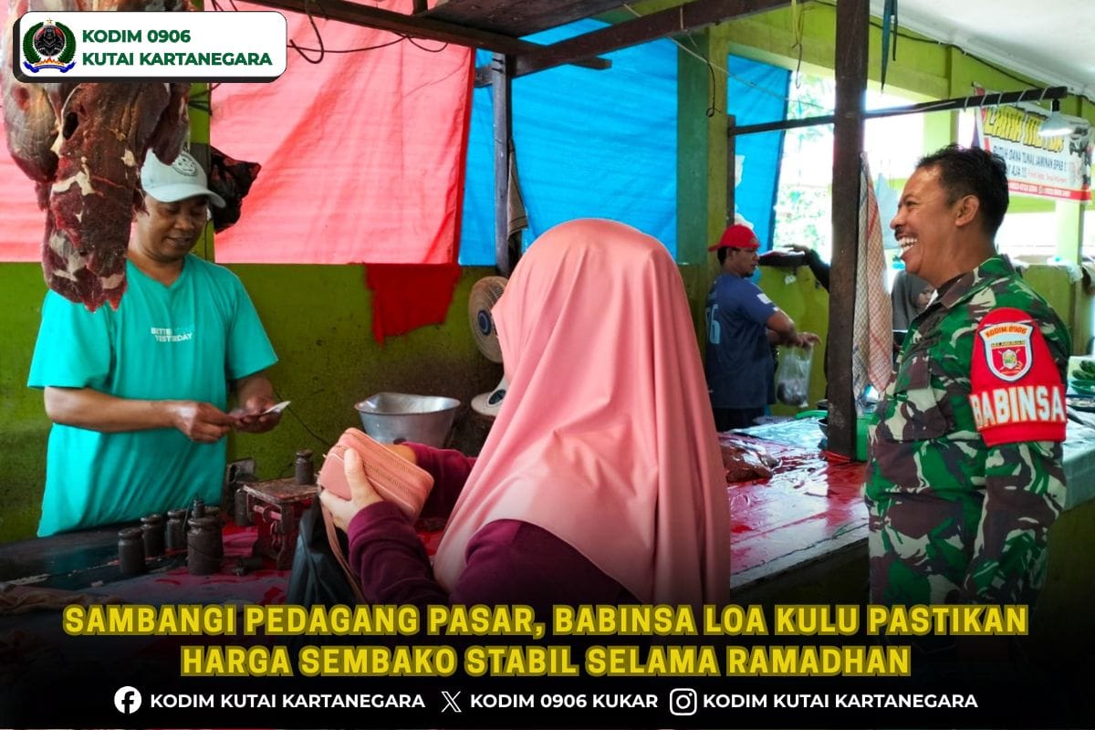 Kutai Kartanegara, mojopaitnews– Guna mengetahui perkembangan harga kebutuhan pokok selama bulan suci Ramadhan, Babinsa Koramil 0906-02/Loa Kulu, Serka M. Yusuf melaksanakan kegiatan pemantauan harga sembako dengan menyambangi para pedagang di pasar tradisional Loa Kulu yang berada di Jalan S. Parman Desa Loa Kulu Kota Kecamatan Loa Kulu, Kamis (26/2/2026).